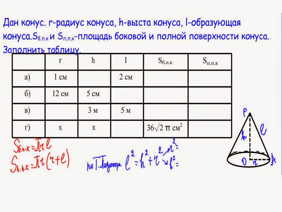 Длину образующей L вычисляют по теореме Пифагора из прямоугольного треугольника.